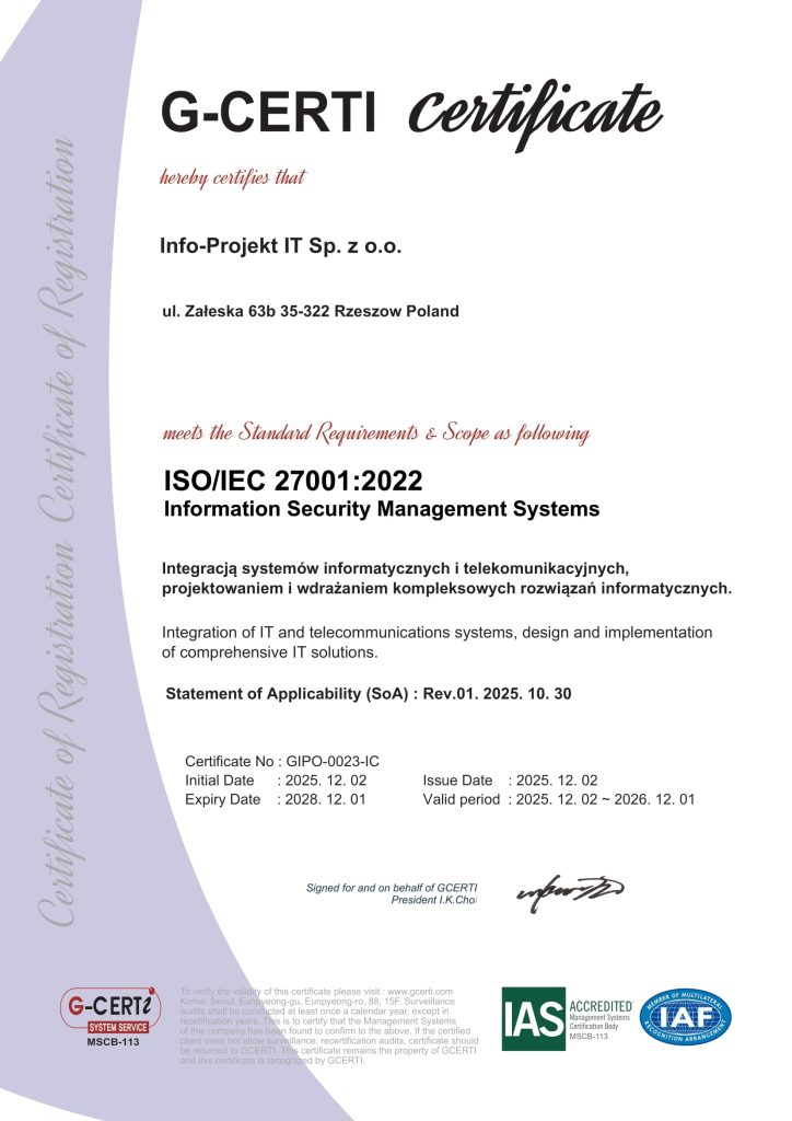 Z radością informujemy, że nasza firma uzyskała certyfikat ISO 27001:2022, potwierdzający spełnienie międzynarodowych standardów w zakresie zarządzania bezpieczeństwem informacji.
